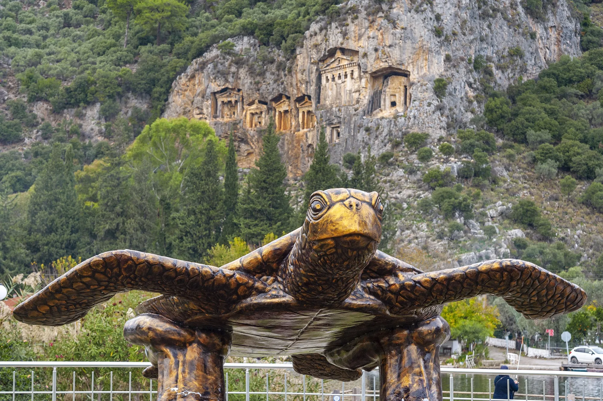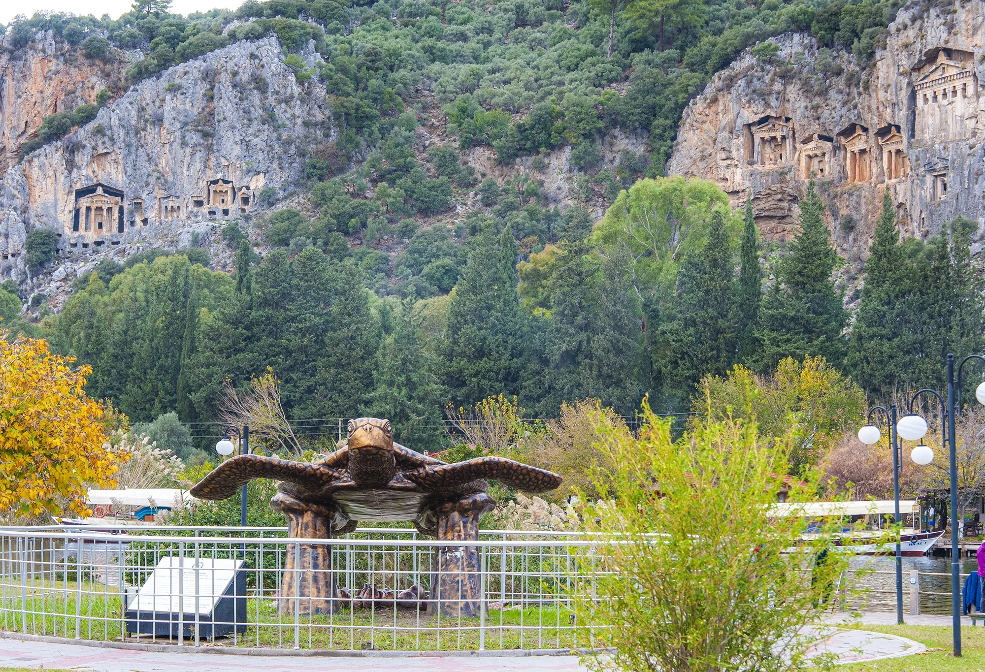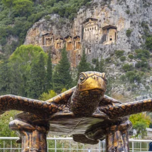 Kayalıklara oyulmuş Dalyan manzaralı Kaya mezarları Kaunos’u diğer antik kentlerden farklılaştırıyor. İlk kez Kaunos’ta görülen tapınak cepheli kaya mezarları Urartu, Frig ve Likya bölgelerindeki kaya mezarı cephe mimarisinden farklı. Kendine has görünümüyle Hellen Tapınağı cephe mimarisini yansıtmakta ve böylelikle diğer kaya mezarı tiplemelerinden uzak. Kayalıkların sağ tarafında altı adet tapınak tipli mezar, kayalara bir heykeltıraş inceliğiyle oyulmuş. Kaya mezarları tüm ihtişamıyla 2 bin 400 yıldan bu yana geçmişin dilsiz şahitleri… Dalyan Nehri’nden görülebilen Kral Mezarları’nın sırrı, Antik Çağ’da insanların mezar ne kadar yüksekte olursa tanrıya o kadar yakın olacağına olan inanç.